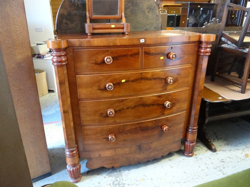 A Victorian mahogany bow fronted chest of drawers, two short above three long, with column supports
