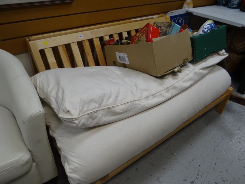 A pine folding futon / bed settee with cushion / mattress