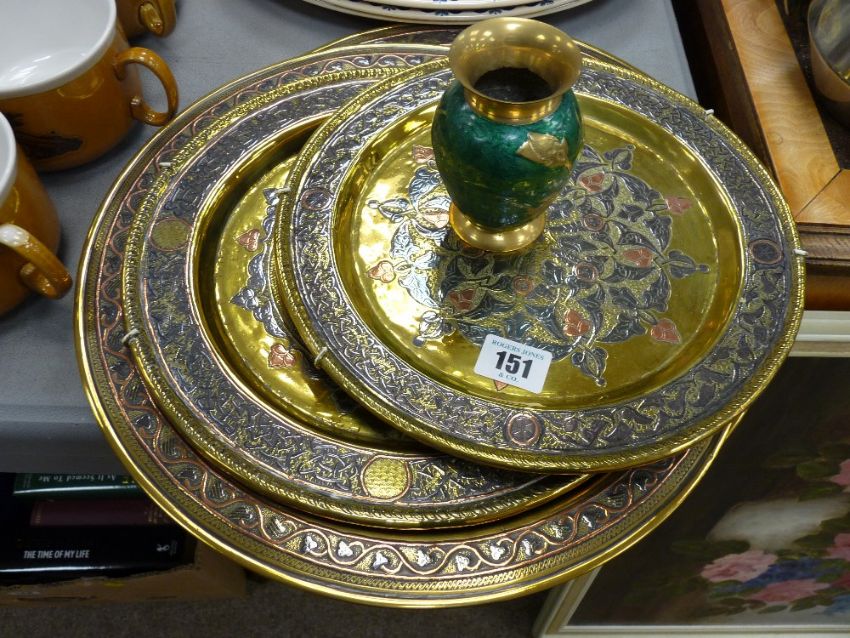 Two pairs of colourfully decorated brass display plates and a modern brass vase