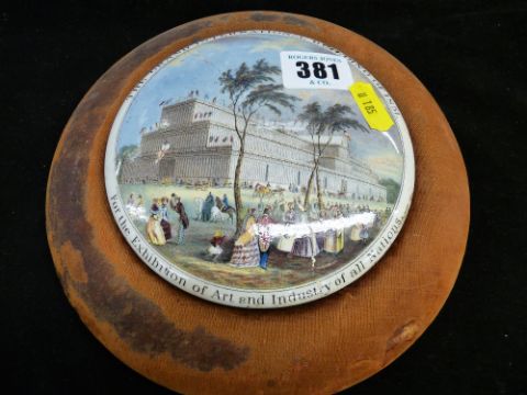 Mounted Prattware pot lid titled 'The Grand International Building of 1851 for the Exhibition of Art and Industry of all Nations' (damaged)