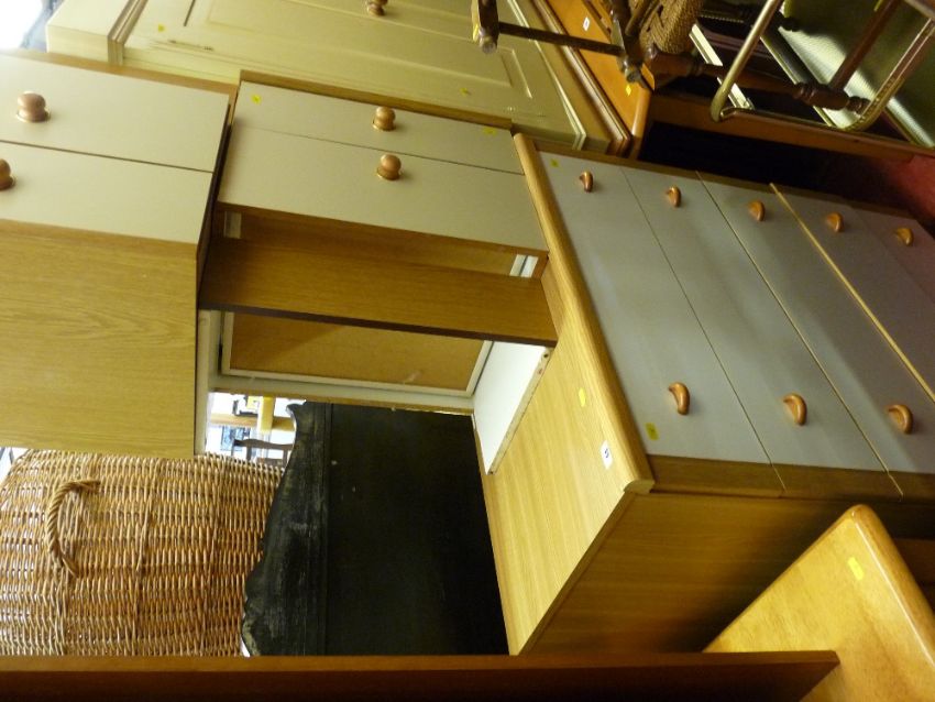 Light wood effect and white chest of five drawers and a pair of similar narrow chests