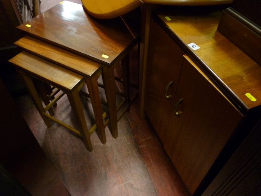 Two door cupboard and a nest of three mahogany coffee tables