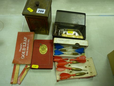 Brass 1953 tea caddy, parcel of darts and a savings bank money box