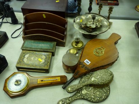 Parcel of plated and brassware, pair of bellows, small boxes, stationery rack etc