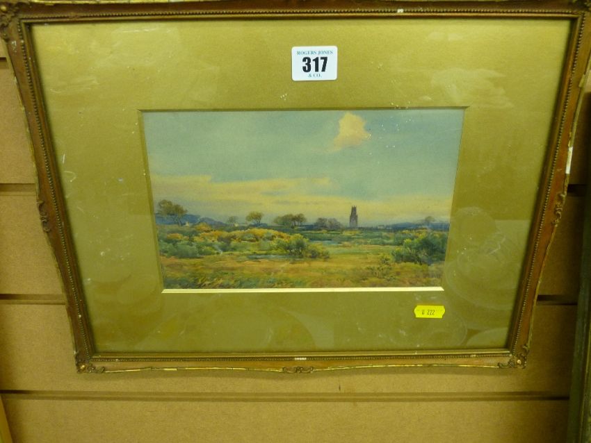 Gilt framed watercolour study - rural scene with abbey spire to the background, indistinctly signed