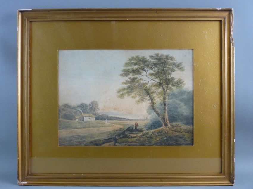 19th CENTURY BRITISH SCHOOL watercolour - two figures under a tree with cottage and distant water, (for restoration, areas of foxing), 23.5 x 33 cms