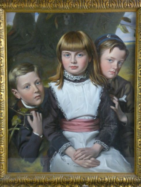J D MERCIER gouache - portrait study of three children, circa 1885, the sitters being the children of the late Dr John Armer Williams of Llanllyfni, Caernarvonshire, 75 x 60 cms, behind glass in a classically styled gilt frame