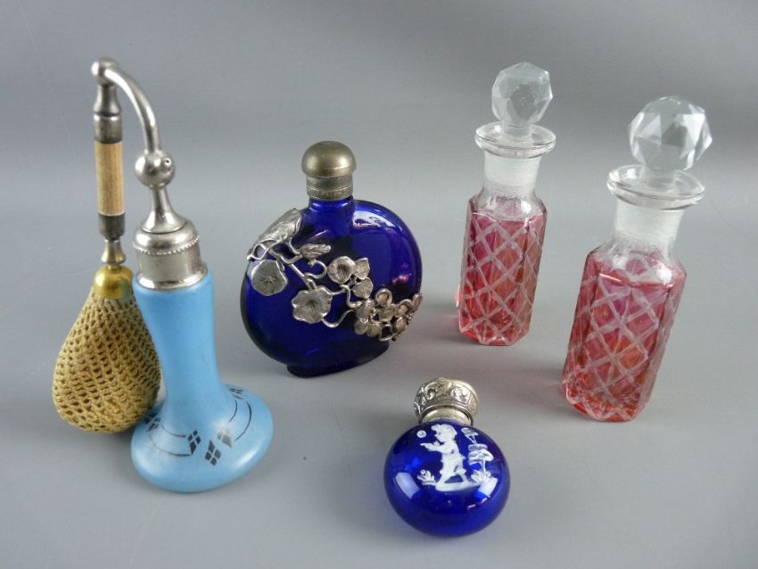 FIVE VINTAGE & LATER GLASS SCENT BOTTLES including a 1930's example with atomizer, two facet cut with stoppers and applied ruby decoration, a Bristol blue circular example with Mary Gregory style decoration and white metal hinged lid and interior glass stopper with a further blue glass example having screw-on top, stamped 'First Impressions, Made In England', the body with white metal overlay of leafy vines, various measurements