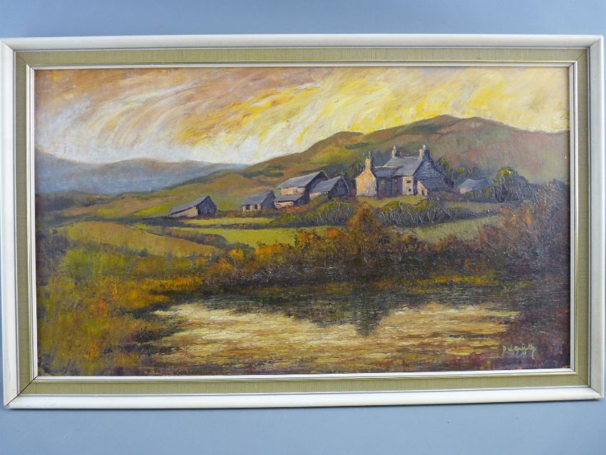 DAISY WYN GRIFFITH (of Anglesey) early oil on board - farmstead scene, signed and with title label verso 'South Stack Farm, Holyhead', 34 x 60 cms