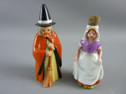 A ROYAL WORCESTER SNUFFER and a Dutch girl bottle with cork stopper, the snuffer in the form of a witch with red cloak and black hat, 'Royal Worcester, Made in England' interior stamp in puce (chip to base of cloak), 9 and 8 cms high respectively