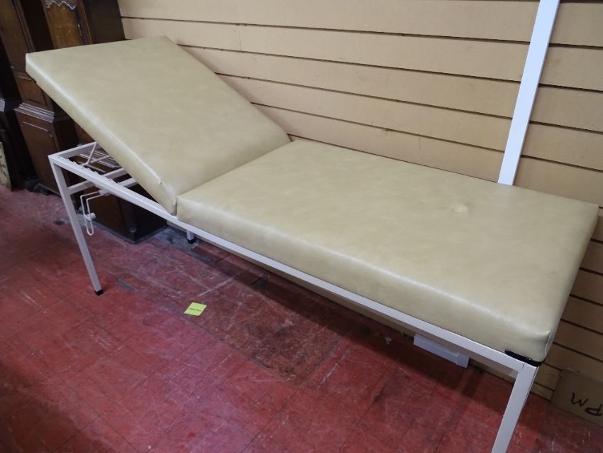 A MEDICAL/PHYSIO COUCH - fixed height with light coloured wipe down upholstery and adjustable head end, 80 cms high, 183 cms long, 61 cms wide