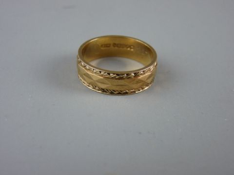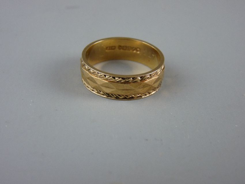 A NINE CARAT GOLD WIDE WEDDING BAND with diamond and feather edging pattern, 3.5 grms
