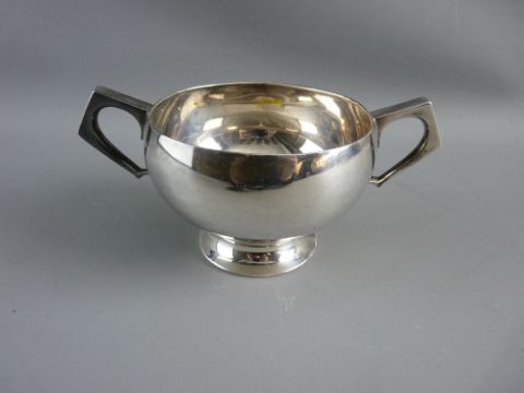 A SILVER TWIN HANDLED BOWL on a circular base, London 1919, 5.6 troy ozs, 10 cms diameter