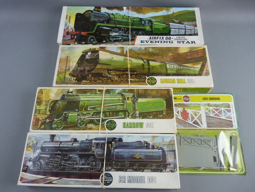 MODEL RAILWAY - Airfix 00 scale unmade boxed kits, 'Evening Star', limited production 'Biggin Hill', 'Harrow' and 'BR Mogul', complete (4) Airfix track-level crossing