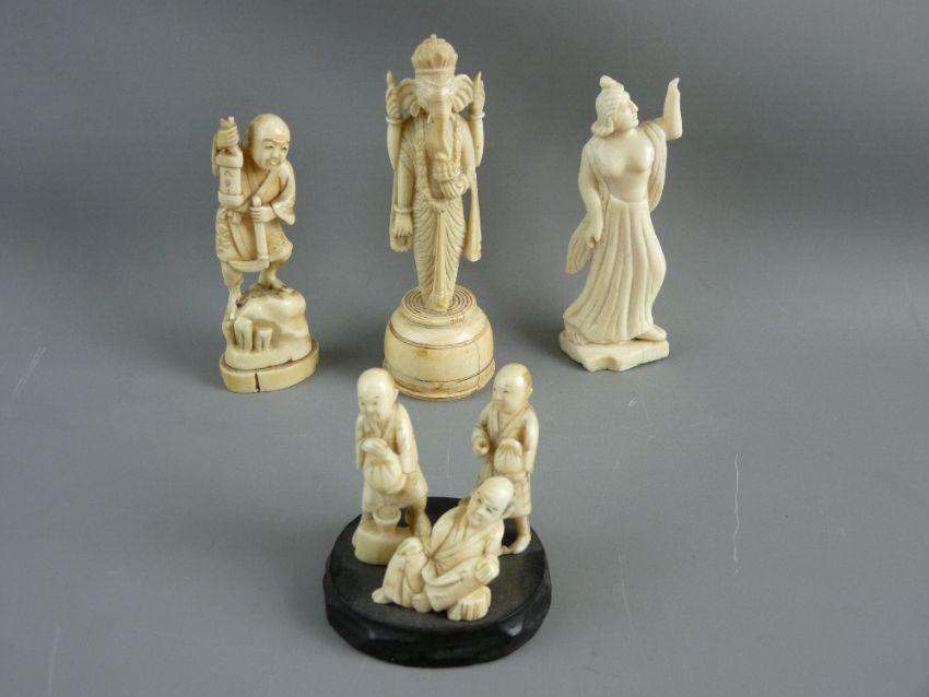 TWO SMALL JAPANESE OKIMONO, an Indian carved ivory deity and a figurine of a scantily clad female, various measurements