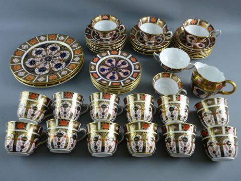 FORTY FIVE PIECES OF ROYAL CROWN DERBY '1128' TEAWARE to include three 20 cms diameter plates, early backstamps, seven 15.5 cms diameter side plates (one un-numbered), seventeen 14.5 cms diameter saucers (two chipped, two cracked, three un-numbered), one twin handled cup (dull ping, un-numbered) a gilt handled milk jug (un-numbered), twelve matching 6.5 cms high cups (one with dull ping) and four other cups (one chipped, all un-numbered), all backstamps showing first quality