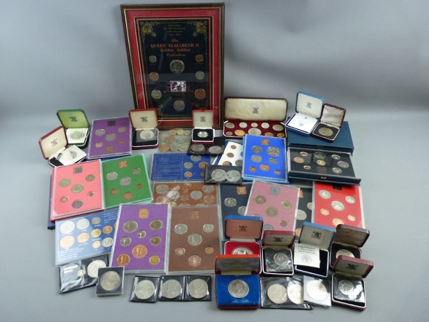 GB & UK COINS - proof sets, crowns and commemoratives including a Royal Mint 1953 Coronation set, cased 1983 and 1984 proof coins, a 1968 decimal transfer set and first decimal coins, coinage of Great Britain from 1970 through to 1982 Royal Mint proof sets, 1983 and 1987 proof pounds, 1972, 1977 and 1981 proof crowns, thirteen commemorative crowns, three Churchills, a framed Queen Elizabeth II Golden Jubilee collection along with other decimal and pre-decimal coins including two Royal Mint 1973 St Helena cased coins (forty six plus)