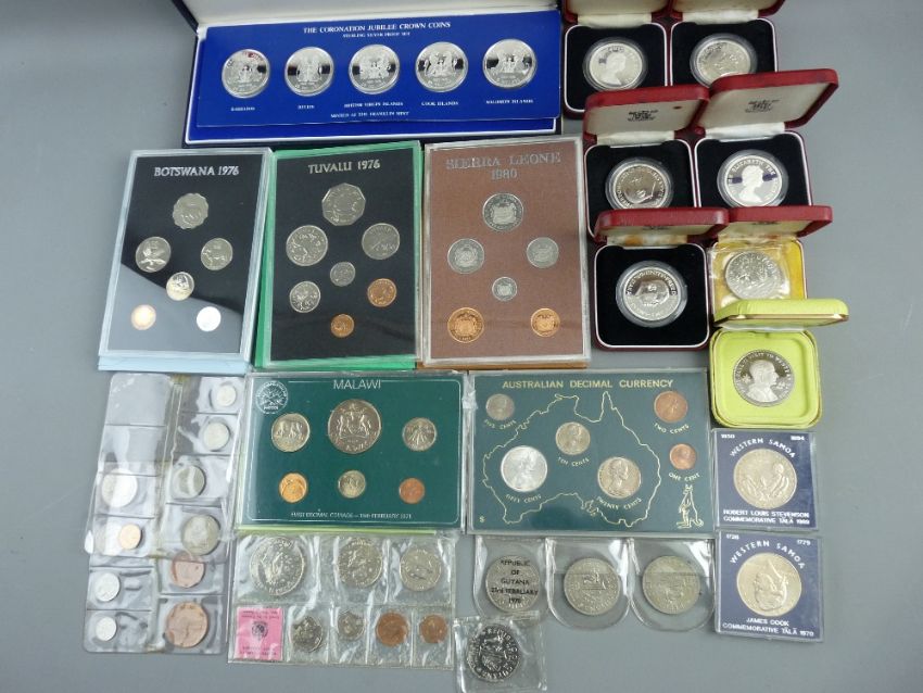 COMMONWEALTH COINS - a mixed collection including a 1976 Tuvalu proof set, two 1976 five dollar coins in silver, a 1980 Sierra Leone proof set, three 1974 Royal Mint one Leone coins in silver, a 1978 Coronation Jubilee crown coins silver proof set, decimal specimen coinage sets for Malawi and Australia and further coinage for Ghana, Western Samoa and Botswana etc (twenty two)