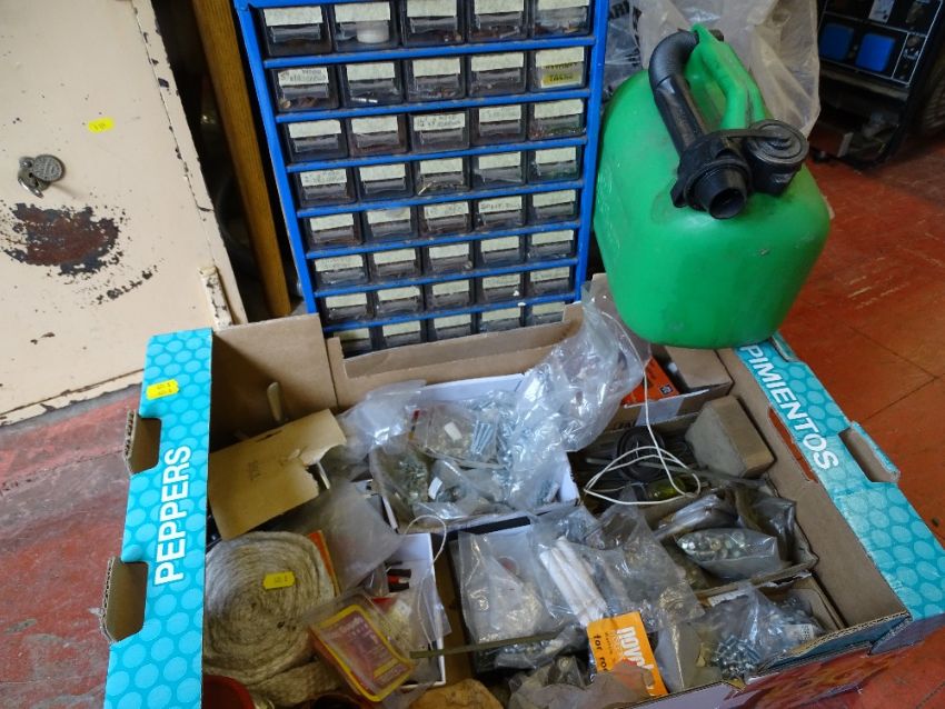 Box of fittings along with a multi-drawer chest with screws, nuts and bolts contents