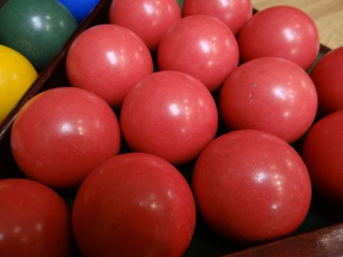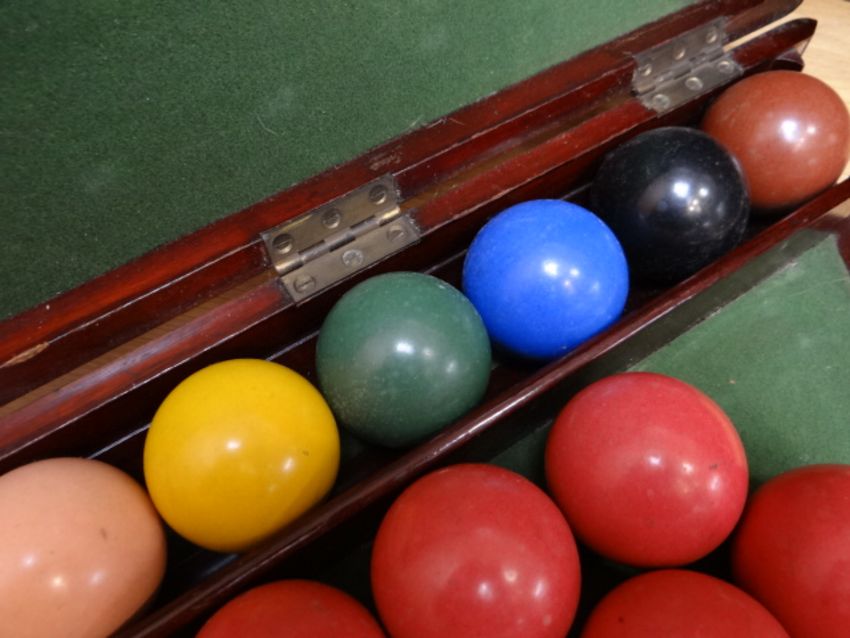 A mahogany billiard / snooker cue stand together with a near complete cased set of not believed ivory snooker balls by Burroughes & Watts Ltdcondition report: the balls are 5.5cms in diameter