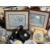 Two vintage BT telephones (one black, one cream) together with two framed prints