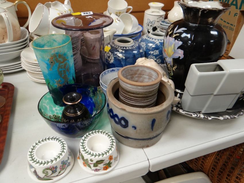 Parcel of mixed china & glass including half glass vase, Chinese ginger jars, two Portmeirion 'Botanic Garden' egg cups, novelty teapot etc
