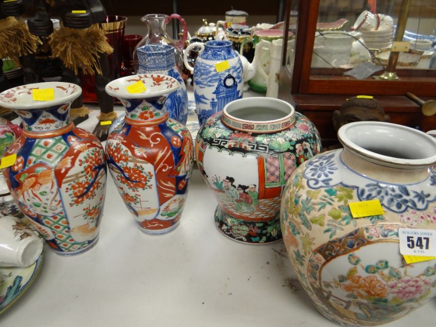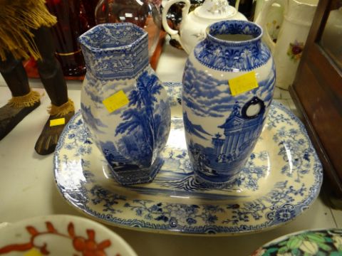 A possibly Swansea blue & white platter, two Staffordshire vases & a selection of Chinese vases & ginger jar