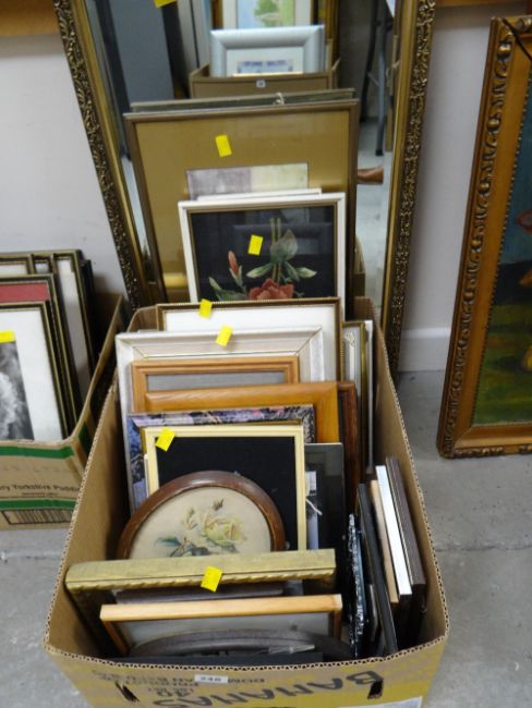 Box of various small prints, pictures, frames, watercolour of a still life & modern gilt wall mirror