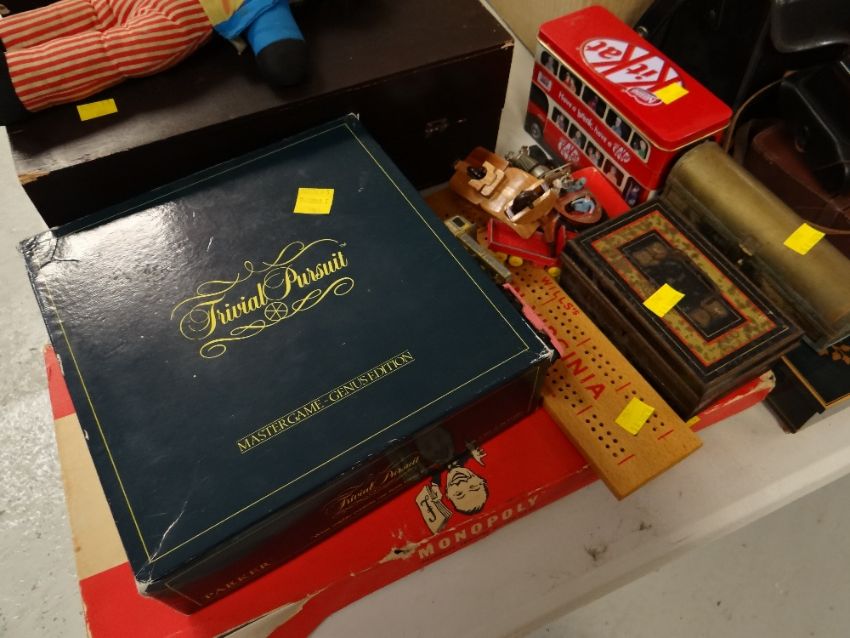 Two boxed collector's dolls, vintage golly, vintage games & tins etc