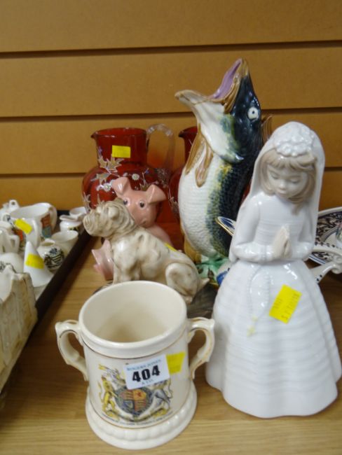 Crown Devon bulldog figure, Nao figure of a young girl, Natwest pig, two ruby glass & decorated jugs