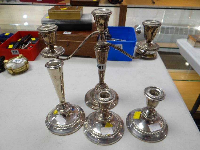 Candelabra, pair of small candlesticks together with another candlestick, white metal believed to be silver but not tested