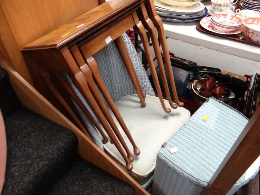 A blue painted loom-style bedroom chair & clothes basket together with a decorated topped nest of three tables