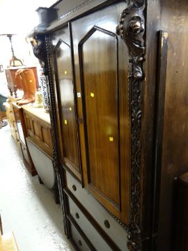 An early twentieth century oak press cupboard with three drawers & profuse carving to the side