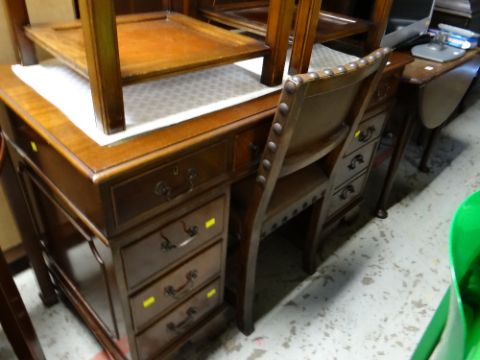 A nice compact reproduction mahogany kneehole desk with green leather tooled top together with a chair
