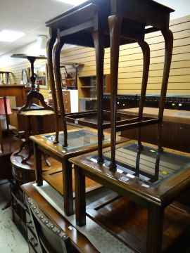 Two modern glass topped lamp tables together with a nest of two tables