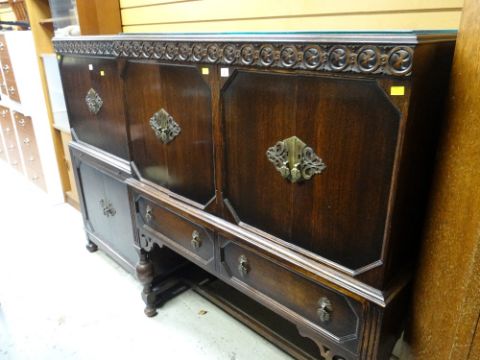 An antique reproduction dark oak raised sideboard with two cupboards above two drawers