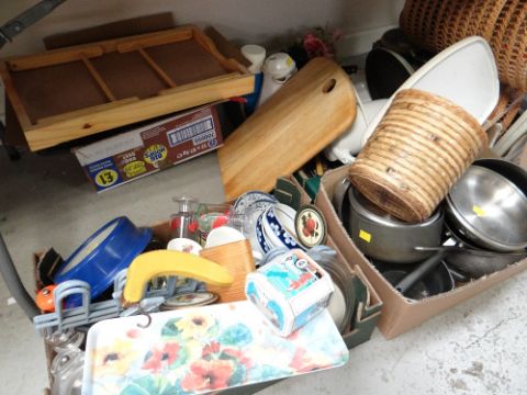 Large parcel of various kitchen ware including saucepans, storage jars, china etc