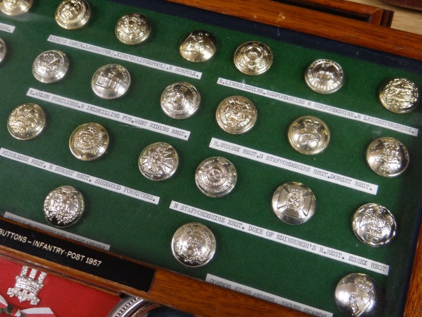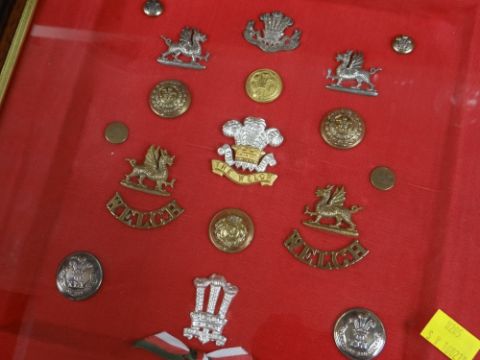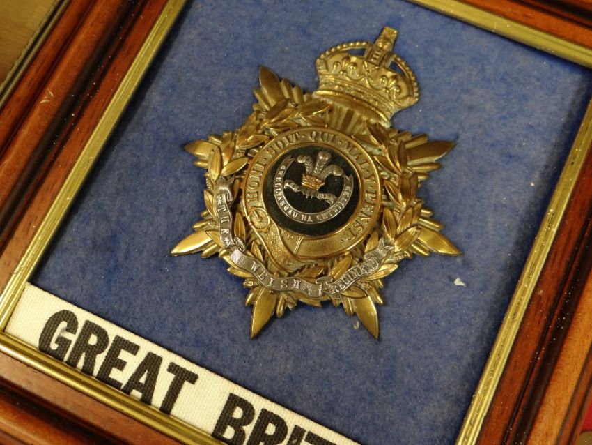 Collection of cased insignia, helmet badge, embroidered badges relating to the Welsh Regiment
