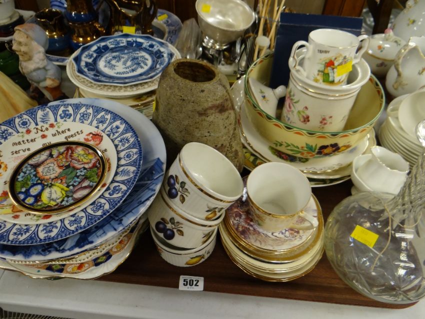 Tray of various china & glassware, commemorative plates, ramekins etc