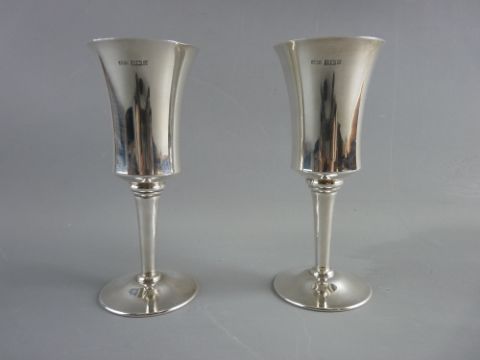 A PAIR OF SILVER CHAMPAGNE FLUTES of waisted form on circular footed stems, Birmingham 1970, 11.2 troy ozs gross, 16.5 cms high
