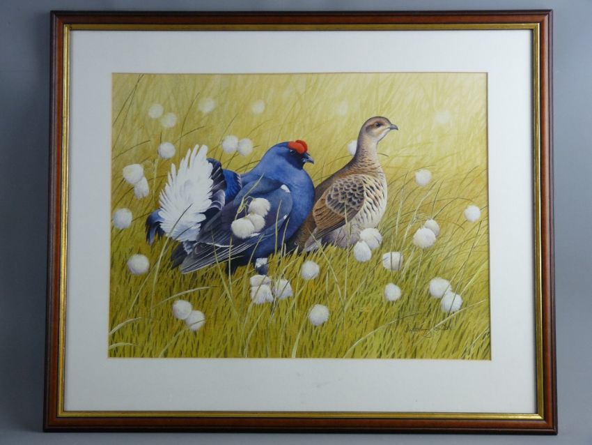 ANTHONY SMITH watercolour - a black grouse and a female in alert mode, signed, 38 x 50 cms