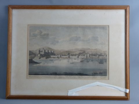 A COLOURED ENGRAVING - 'A West Prospect of Conwy Castle in Caernarfonshire' after BOYDELL, published 1749, 30 x 46 cms, (care please, glass broken)