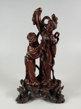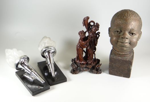 A PAIR OF CHROME TORCH LIGHT-SCONCES on wooden mounts, 26cms high together with an Oriental carved hardwood figurine on a naturalistic base, 27cms high and a plaster bust of a boy