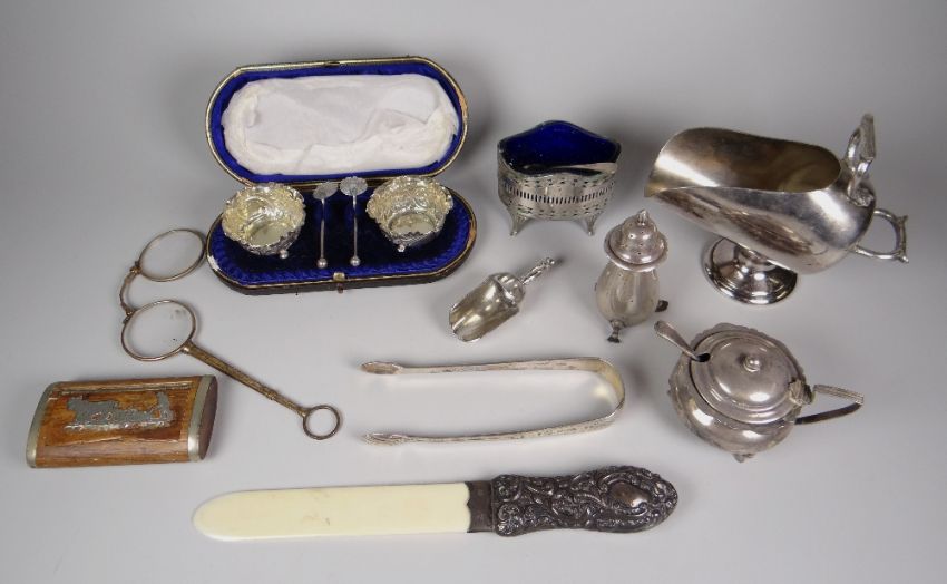 A PARCEL OF SILVER INCLUDING CASED PAIR OF SALTS together with a silver-handled page-turner and a non-silver snuff-box etc