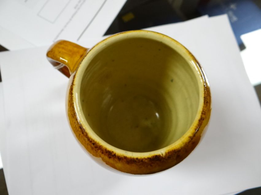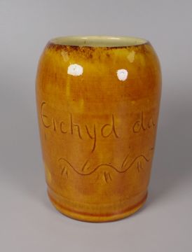 AN EWENNY POTTERY TANKARD inscribed 'Eichy da' (the incorrect spelling of Iechyd Da - good health), 14cms high (BBC Bargain Hunt)