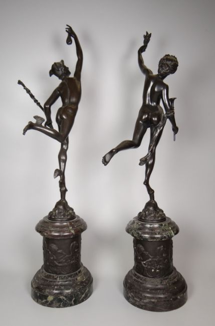 AFTER CLODION, A SUPERB PAIR OF BRONZES OF MERCURY AND CERES standing on relief decorated pedestals with veined marble bases, 58cms high.