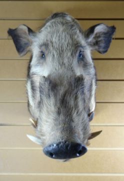 A LARGE TAXIDERMY BOAR'S HEAD & SHOULDERS, with composition mouth, original teeth and glass eyes, 60cms high