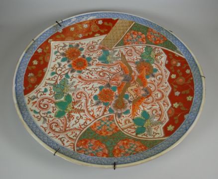 AN IMARI POTTERY CHARGER typically decorated with blue border and exotic flora and fauna, 46cms diam