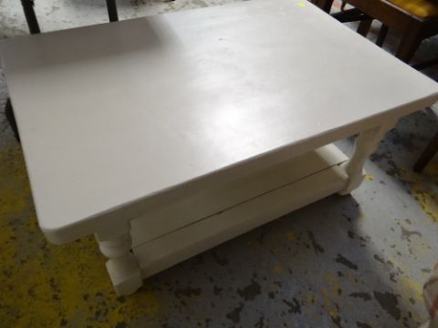 Parcel of furniture to include a distressed painted white high back chair, coffee table