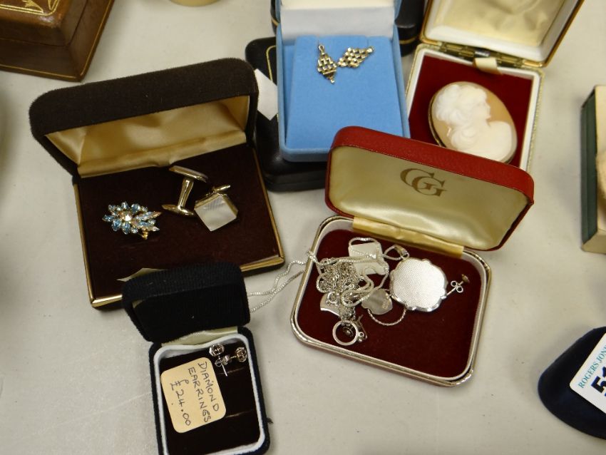 A parcel of silver & white metal cuff links, 9ct gold earrings, cameo brooches etc